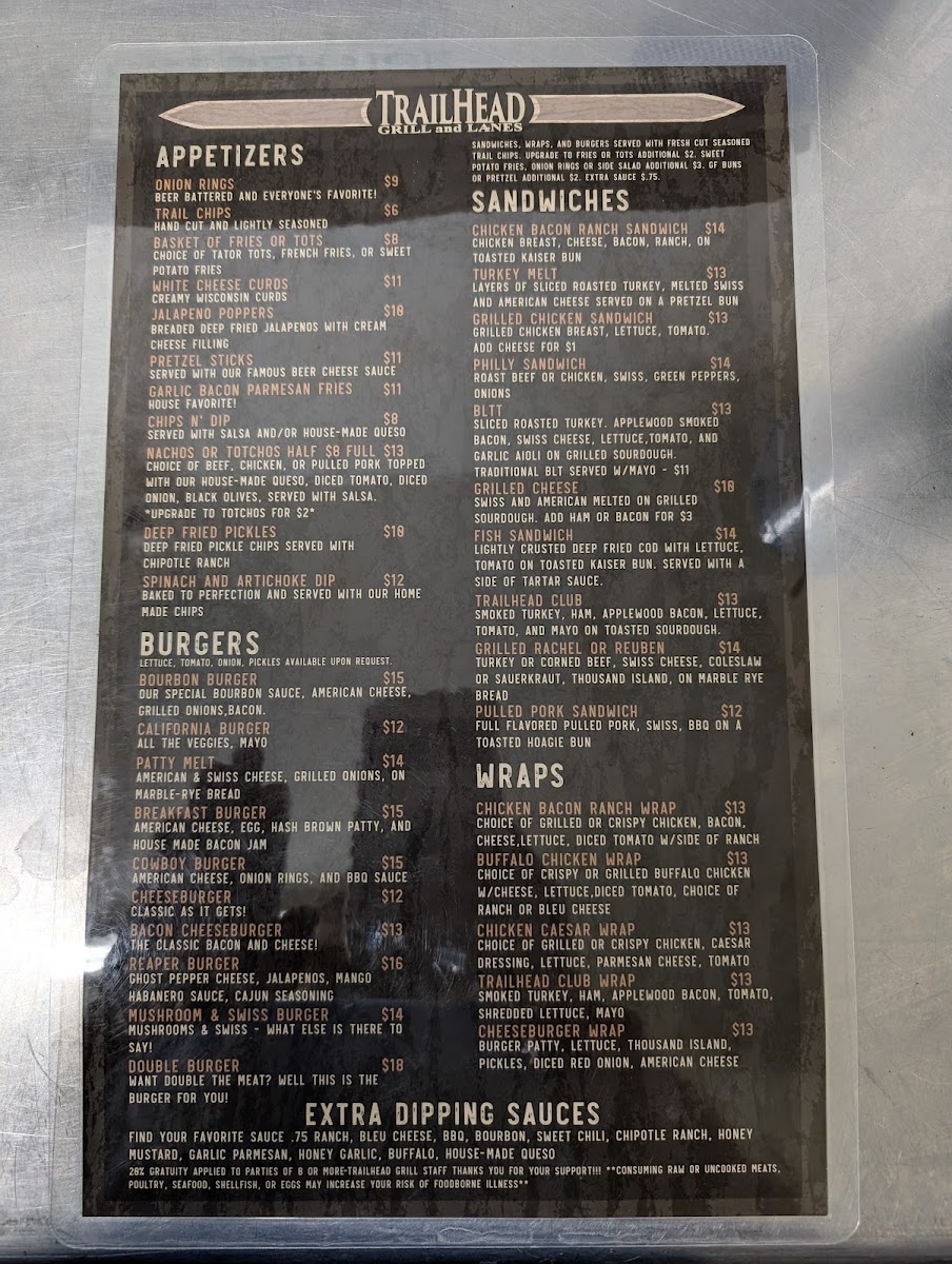 Trailhead Grill and Lanes offers a menu that beautifully combines comfort food with a few unique twists, making it an excellent choice for anyone looking for a satisfying meal. Their selection of salads is perfect for those looking for something lighter or as a side to complement the rest of the menu. You can opt for a Chicken Salad, a Chicken Caesar Salad, or a Taco Salad (Beef) or Taco Salad (Chicken), each providing a fresh and flavorful option.